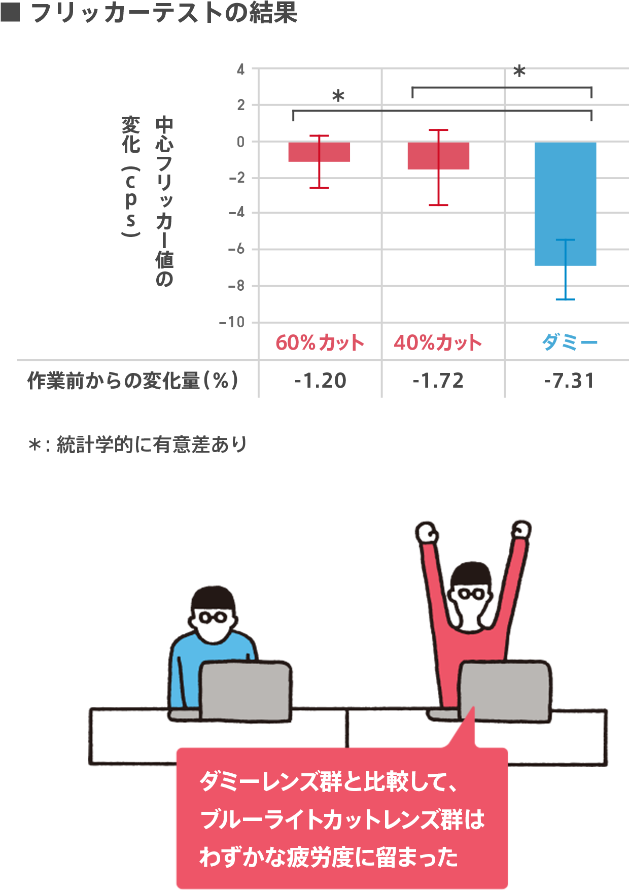 最近、学童を対象に就寝前にブルーライトカットメガネを使用する研究を行いました。就寝前の3時間の装用を2週間続けてもらうと、1週目より2週目に、就寝時刻や起床時刻が早くなり、兄弟に対する暴言などの日中の問題行動が減少する傾向が見られました。つまり習慣として続けることが大事です。